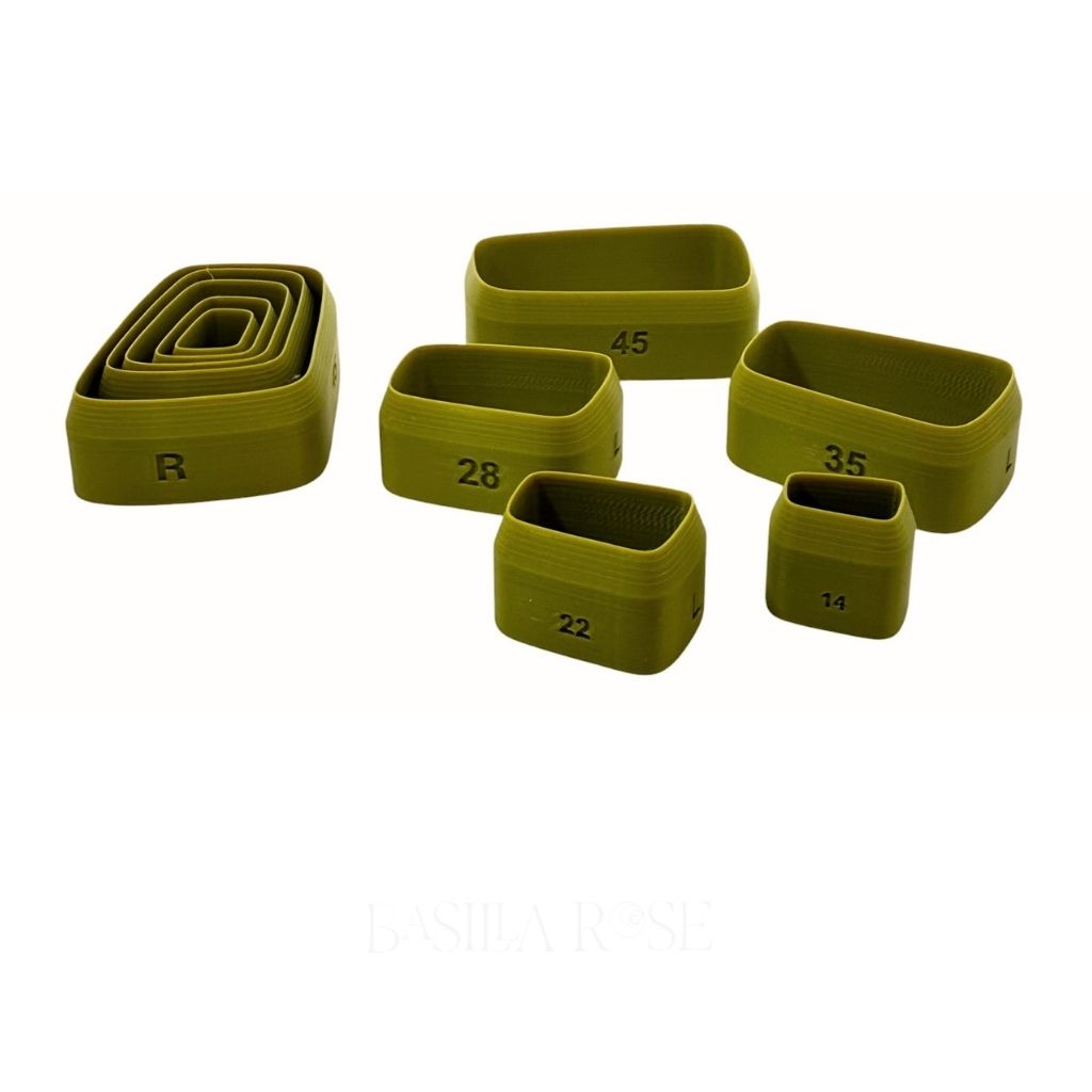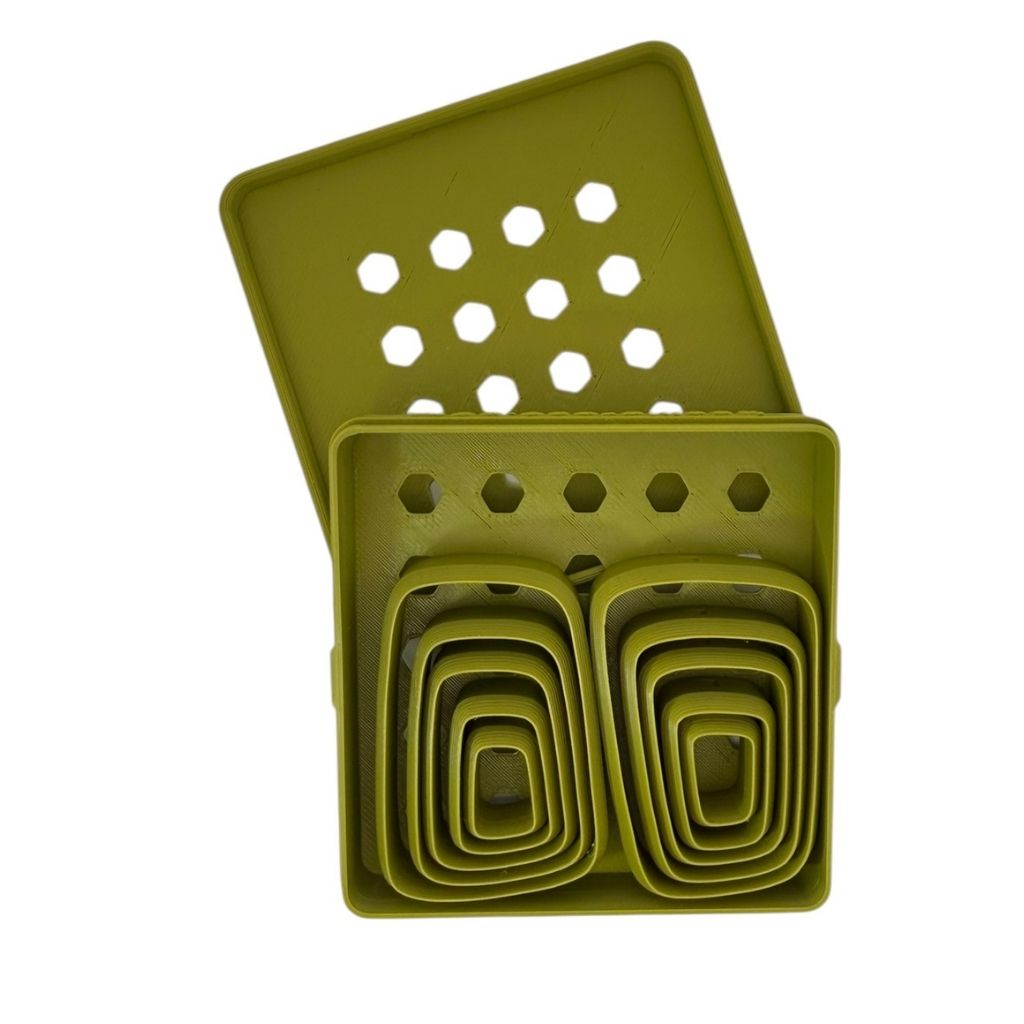 A modern angled rounded-rectangle cutter set designed for movement, balance, and bold shape-building. The DriftAngl Graduated Cutter Set includes mirrored Left & Right orientations with graduated sizes, plus a matching Hex Box for organized storage.